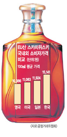 수입업체는 스카치위스키 15종을 100㎖당 평균 2664원에 들여와 유통업체에 8376원을 받고 넘긴다. 유통업체는 소비자에게 1만3501원에 판매한다. 소비자가격에서 수입가격을 뺀 수입업체와 유통업체의 유통수입이 1만837원이나 된다.