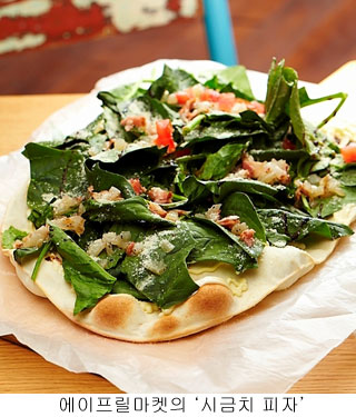 에이프릴마켓의 대표 메뉴인 ‘시금치 피자’는 기름기가 쏙 빠지도록 구워낸 도우에 웰빙 채소인 시금치를 토핑으로 듬뿍 얹어 신선한 식감을 느낄 수 있는 메뉴로 시금치의 재발견이라 할 수 있을 만큼 맛 또한 뛰어나다.