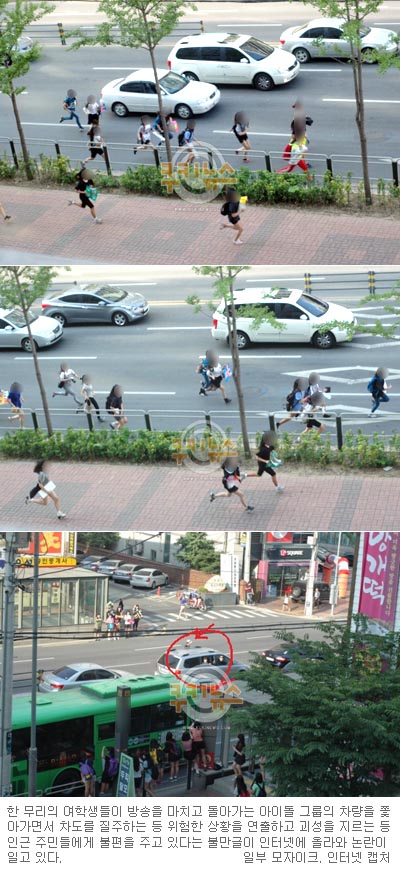 한 무리의 여학생들이 방송을 마치고 돌아가는 아이돌 그룹의 차량을 쫓아가면서 차도를 질주하는 등 위험한 상황을 연출하고 괴성을 지르는 등 인근 주민들에게 불편을 주고 있다는 불만글이 인터넷에 올라와 논란이 일고 있다. 네티즌들은 어린 학생들의 극성스러운 행동에 혀를 차고 있다.