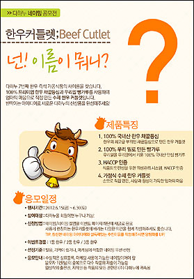 [쿠키 건강] 한우전문쇼핑몰 다하누몰이 새롭게 선보일 한우 즉석 가공식품 출시를 앞두고 신제품 네이밍 공모전을 전개한다.