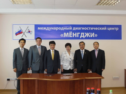 지난 22일 명지국제검진센터가 들어설 연해주 검진센터 2층 회의실에서 가진 한·러 합작 법인 설립 조인식에는 손건익 보건복지부 차관과 이양구 주블라디보스토크 총영사, 이왕준 명지의료재단 이사장 등이 참석했다.