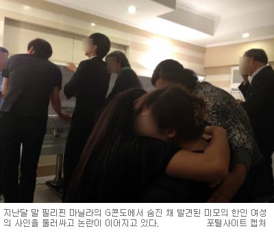 [쿠키 사회] 지난달 말 필리핀 마닐라의 G콘도에서 숨진 채 발견된 미모의 한인 여성 A씨(34)의 사인을 둘러싸고 논란이 이어지고 있다. 현지 경찰이 자살에 무게를 두고 수사를 벌인다는 소식에 유족과 지인, 필리핀 거주 한인들은 타살 가능성이 높다며 반발하고 있다. 이들은 또 우리 외교 당국에게 보다 강력하게 대처해줄 것을 호소하고 있다.