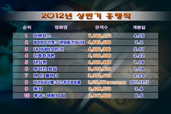 더불어 모든 면엔 양과 음이 있지요. 흥행 톱10에 한국영화가 7개인 것도, 역다 최다 관객인 것도 다 반갑지만 1위작 <어벤져스>의 관객 706만과 2위작 <범죄와의 전쟁> 468만 명의 커다란 차이는 아쉬운 게 사실입니다. 또 지난해 11월 개봉한 <미션 임파서블: 고스트 프로토콜>이 올해 성적만 카운트 돼 8위에 오르긴 했지만 누적 관객 수는 755만. 진정 친절한 ‘톰 아저씨’나 스크린으로 이동한 마블코믹스 만화책의 영웅들에게만 가능한 영광인 건가요.