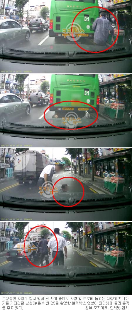 [쿠키 사회] 운행중인 차량이 잠시 멈춰 선 사이 슬며시 차량 앞 도로에 눕고는 차량이 지나가기를 기다리던 남성을 촬영한 블랙박스 영상이 인터넷에 올라 충격을 주고 있다. ‘수유리 배회남’이라는 별명이 붙은 이 남성이 자해 공갈단인지 자살 시도자인지에 대한 의견이 분분한 가운데, 네티즌들은 애꿎은 운전자를 살인자로 만들 뻔했다며 혀를 내두르고 있다.