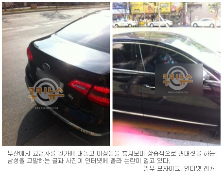 [쿠키 사회] 제주 올레길과 경남 통영에서 여성을 노린 끔찍한 범죄가 잇따라 발생하며 온 국민을 충격에 빠뜨린 가운데 이번에는 부산에서 차를 길가에 대놓고 여성들을 훔쳐보며 상습적으로 변태행각을 벌이는 남성을 고발하는 글과 사진이 인터넷에 올라 논란이 일고 있다. 네티즌들은 문제의 남성이 타는 차를 빗대 이 남성에게 ‘K7 변태남’이라는 별명을 붙이고 비난을 퍼붓고 있다.