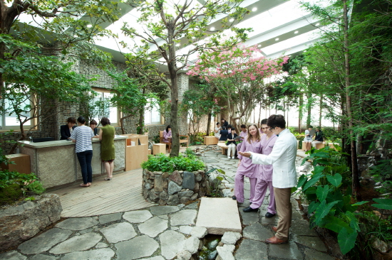 오솔길로 꾸며진 검진센터의 통로는 화산석으로 연결돼 있으며, 숲 속 나무 그늘에는 원목으로 된 벤치와 나무의자들이 곳곳에 마련돼 있어 검진 대기자들이 편안하고 건강하게 휴식을 취할 수 있다.