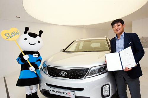 사진은 이종범씨가 기아차의 어린이 교통안전 캠페인 마스코트인 ‘살피미’와 기념촬영을 하는 모습.