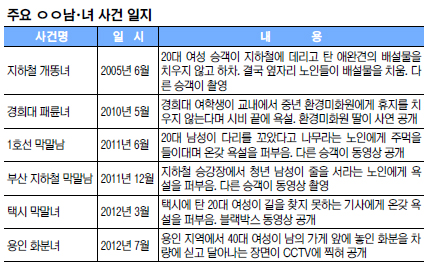 ◇법은 멀고 인터넷은 가깝다=2005년 애견을 데리고 지하철에 탔다가 개가 싼 똥을 치우지 않고 그냥 내리는 동영상이 유포되면서 공분을 샀던 ‘지하철 개똥녀’가 ‘○○남(녀) 시리즈’의 시초이다. 2003년 딸기를 들고 있는 여성의 스틸 사진이 각종 패러디를 양산하며 ‘딸녀’라고 불린 적이 있긴 하다. 하지만 물의를 빚어 공분을 일으키는 개념으로 굳어진 오늘날의 ○○남(녀)의 개념과는 약간 다르다. 이후 사치와 허영에 물든 ‘된장녀’, 방청객으로 출연해 키 작은 남성을 비하하는 발언을 했던 ‘루저녀’ 등 숱한 ‘○○녀’들이 꼬리를 물었다. 지하철 승강장에서 줄을 서라는 노인에게 갖은 욕설을 퍼부었던 ‘지하철 막말남’과 고속버스 좌석에서 자위행위를 하는 모습이 폭로된 ‘고속버스 변태남’ 등 ‘○○남’들도 인터넷을 달궜다.