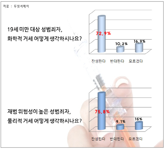 리서치기업 두잇서베이가 지난 6일부터 7일간 인터넷과 모바일앱 두잇서베이 사용자 4618명을 대상으로 ‘19세미만 성범죄자의 화학적 거세를 어떻게 생각하느냐’는 물음에 응답자의 72.9%가 이를 ‘찬성한다’고 답했다. 재범 개연성이 높은 성범죄자의 물리적 거세에 대해서도 응답자의 75.8%가 찬성하는 것으로 나타났다.