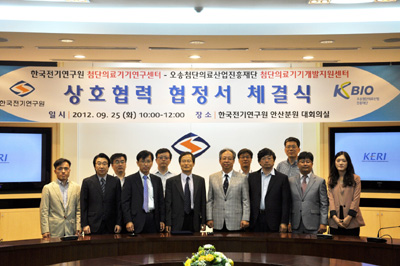 KERI 첨단의료기기연구센터(센터장 김관호)는 25일 전기연구원 안산분원에서 오송첨복단지 첨단의료기기개발지원센터(센터장 김선일)와 의료기기 공동개발을 위한 상호협력 협정을 체결했다고 밝혔다.