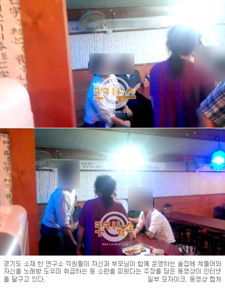 [쿠키 사회] 경기도 소재 한 연구소 직원들이 자신과 부모님이 함께 운영하는 술집에 쳐들어와 자신을 노래방 도우미 취급하는 등 소란을 피웠다는 주장을 담은 동영상이 인터넷을 달구고 있다. 네티즌들은 ‘술집 난동男’이라는 오명을 얻은 이들의 모습을 보며 혀를 차고 있다.