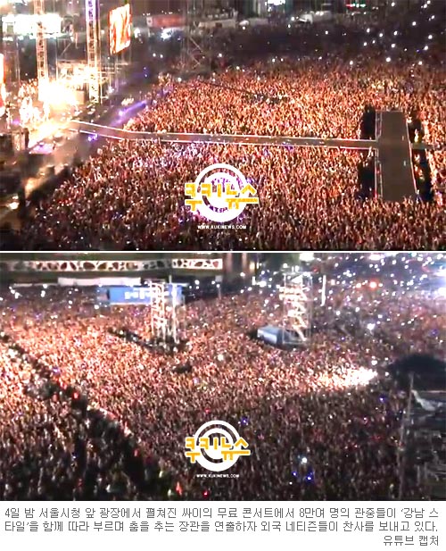4일 밤 서울시청 앞 광장에서 펼쳐진 싸이(본명 박재상·35)의 무료 콘서트에서 8만여 명의 관중들이 월드 히트송인 ‘강남 스타일’을 함께 따라 부르며 춤을 추는 장관을 연출하자 외국 네티즌들이 찬사를 보내고 있다. 동영상 공유사이트인 유튜브나 유명 커뮤니티에서는 싸이와 한국 관중들이 함께 즐기는 장면을 담은 동영상이 ‘다이내믹’ ‘크레이지’ ‘언빌리버블’ 이라는 단어와 함께 5일 하루 종일 오르내렸다.