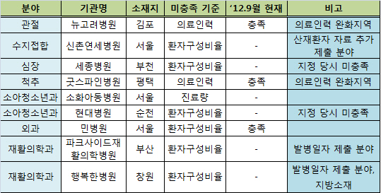 특히 이들 9개 기관 중 개선의 기회를 줬음에도 불구하고 신촌연세병원과 세종병원, 소화아동병원, 현대병원, 파크사이드재활의학병원, 행복한병원 등 6개 기관은 현재까지도 지정조건을 만족하지 못한 것으로 조사됐다.