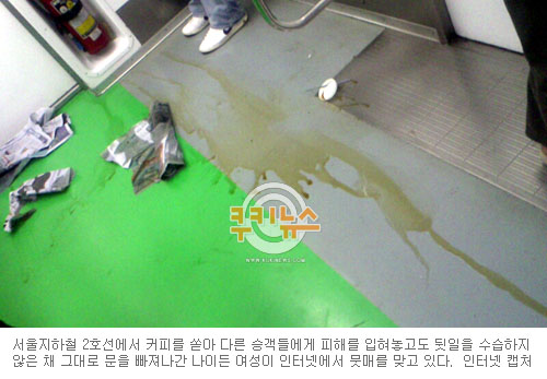 [쿠키 사회] 서울지하철 2호선에서 커피를 쏟아 다른 승객들에게 피해를 입혀놓고도 뒷일을 수습하지 않은 채 그대로 문을 빠져나간 나이든 여성이 인터넷에서 뭇매를 맞고 있다. 네티즌들은 ‘2호선 무개념 커피 아줌마’라며 비난하고 있다.