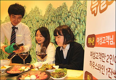 외식문화기업 강강술래 홍대점은 여성고객이 2인 이상 오면 레드와인을 한 잔씩 서비스로 제공하는 이벤트를 상시 진행 중이다. 또 모든 구이메뉴를 2인분 시키면 1인분을 추가로 무료 제공하는 ‘2+1 행사’도 함께 벌인다. 오는 18일까지는 와인에 잘 어울리는 강강술래 갈비맛 쇠고기육포도 50% 할인 판매한다.