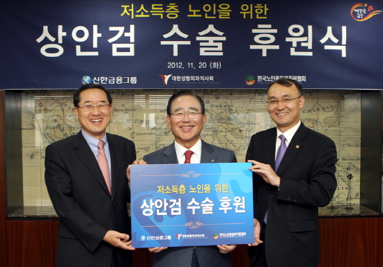 [쿠키 건강] 대한성형외과의사회는 지난 20일 신한은행 본점에서 이상목 대한성형외과의사회 회장, 한동우 신한금융 회장, 이기민 한국노인종합복지관협회 사무총장이 참석해 ‘저소득층 노인을 위한 상안검 수술 후원식’을 가졌다고 밝혔다.