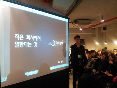 [쿠키 건강] 소셜벤처 보청기 업체 딜라이트가 최근 20여명의 작은 회사 임직원들과 함께 집필한 ‘나는 작은 회사에 다닌다’ 출판을 기념해 취업 준비생들을 대상으로 강연회를 펼쳤다.