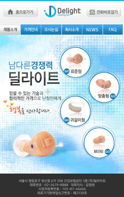 [쿠키 건강] 보청기 업체 딜라이트(대표 김정현)는 자사의 모바일 홈페이지(www.delight.co.kr)를 개설해 본격 운영에 나선다고 4일 밝혔다.