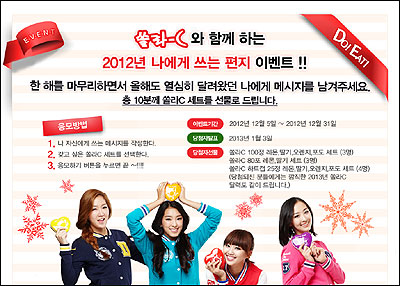 2012년 마지막 이벤트로 고려은단 쏠라씨가 한 해를 마무리하는 연말, 자신에게 응원의 편지를 쓰면 쏠라씨를 선물로 드리는 ‘쏠라C와 함께하는 2012년 나에게 쓰는 편지 이벤트’를 진행한다.