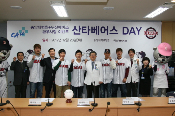 [쿠키 건강] 중앙대병원은 지난 20일 두산베어스 선수단을 초청해 중앙대병원과 두산베어스가 함께하는 환우사랑 이벤트 ‘산타베어스 데이’ 행사를 가졌다.