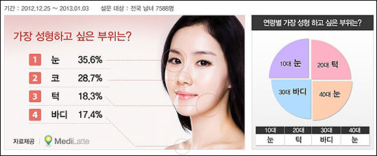 조사결과에 따르면, 전체 응답자의 35.6%가 가장 성형하고 싶은 부위로 ‘눈’을 꼽았다. 특히 10대와 40대에서 ‘눈’ 성형 선호도가 높은 것으로 나타났다. 10대에서는 무려 59%가 가장 선호하는 성형부위로 ‘눈’을 꼽았으며, 40대도 ‘눈’을 성형하고 싶다는 응답이 1위를 차지했다. 반면 20대는 ‘턱’을, 30대는 ‘바디’를 성형하고 싶다는 응답이 가장 많아 연령대별로 성형하고 싶은 부위가 확연히 다른 것으로 조사됐다.