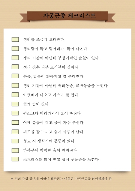 이대여성암병원에서는 여성들이 본인이 자궁근종인지 아닌지 쉽게 의심해볼 수 있도록 14가지의 자궁근종 증상을 담은 체크리스트를 발표했다. 체크리스트의 증상 중에 5가지 이상이 해당되는 여성의 경우 자궁근종을 의심해볼 수 있으며 자궁근종 전문의에게 진료를 통해 확인해보는 것이 안전하다.