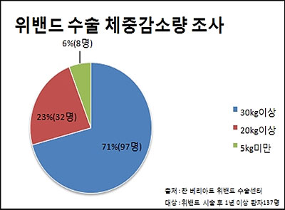 ◇고도비만 환자, 수술적 방법이 가장 효과적… 최대 83.2㎏ 감량 보여= 찬베리아트 위밴드센터에서 수술한 환자 137명을 1년간 추적 관찰한 결과 평균 24㎏의 체중 감량이 있었고, 71%(97명)는 30㎏ 이상의 체중 감량을 보였다. 이번 조사에 참가한 환자 중 214.2㎏(BMI 61.9)이 가장 체중이 많이 나가는 환자로 83.2㎏의 감량을 보였으며, 이 외에도 20㎏ 이상 체중이 감량된 환자도 무려 94%(129명)에 달해 비만이 심할수록 위밴드 수술 효과가 큰 것으로 나타났다.