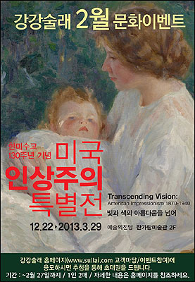 미국 인상주의 대표작가 90명의 작품 130여 점을 선보이는 ‘미국 인상주의 특별전’은 유럽 인상주의와 다른 개성과 특별함을 느껴볼 수 있는 전시로 기획됐다. 국내에서는 처음으로 미국 인상주의의 대표적 작품들을 한 자리에서 감상할 수 있는 좋은 기회가 될 전망이다. 예술의전당 한가람미술관 2층에서 열린다.