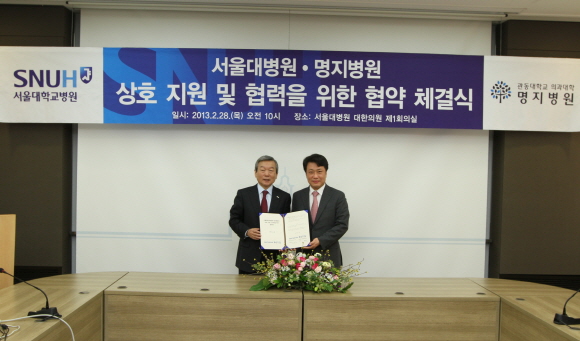명지병원은 28일 서울대병원과 교육렛П막진료럭彭坪퓐沼獰?개발 및 학술교류 등에 상호 지원 및 협력하는 포괄적인 협약을 체결했다고 밝혔다.