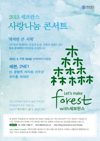 세브란스 사랑나눔 콘서트는 세브란스가 국내 의료기관 최초로 시작하는 대중모금 캠페인인 ‘Let's Make Forest’의 첫 행사로 2NE1, 세븐, 션, 하지원, 이수근, 최수종 하희라 부부, 윤형주 씨의 재능기부로 열리게 된다.