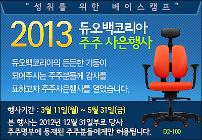 [쿠키 건강] 인간공학 전문기업 듀오백코리아㈜가 주주들에게 듀오백코리아 의자를 특별 할인된 가격으로 제공하는 ‘2013 주주사은행사’를 실시한다.