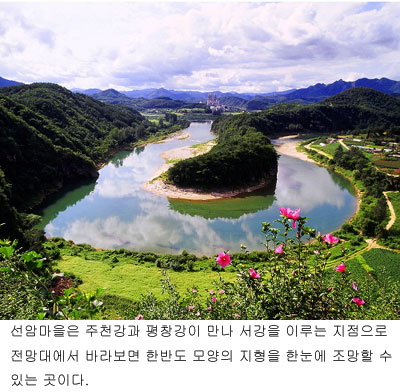 상쾌한 소나무 숲길 산책로를 따라 들어가면 보이는 선암마을은 주천강과 평창강이 만나 서강을 이루는 지점으로 전망대에서 바라보면 백두대간을 연상케 하는 무성한 소나무 숲과 해남의 땅끝마을, 포항의 장기곶과 같은 형상이 오묘하게 닮은 한반도 지형을 한눈에 조망할 수 있는 곳이다.