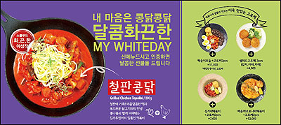 ‘철판콩닭’은 철판 위에 매콤달콤한 떡과 부드러운 닭고기가 어우러진 떡볶이에 콩나물이 얹어져 있는 메뉴로 2인분 기준으로 판매한다. 김가루가 얹어진 밥을 함께 제공해 남은 양념에 비벼먹을 수 있도록 했다.