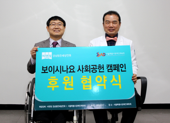 [쿠키 건강] 비앤빛 강남밝은세상안과는 12일 서울특별시장애인체육회와 장애인들의 의료지원을 위한 라식렀撰슨梔?지원 협약을 체결했다고 밝혔다.