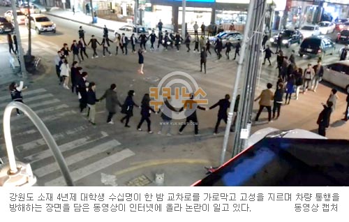 [쿠키 사회] 강원도 소재 4년제 사립대학 학생 수 십 명이 한 밤 교차로를 가로막고 고성을 지르며 차량 통행을 방해하는 모습을 담은 동영상이 인터넷에 올라 논란이 일고 있다. 네티즌들은 “최고 지성이라는 대학생들이 저 모양이니 한심하다”며 혀를 차고 있다.
