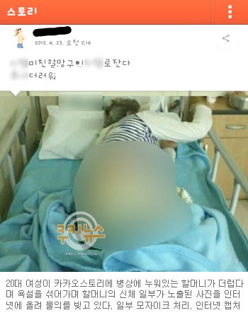 [쿠키 사회] 20대 여성이 병실에 반나체로 몸져 누워있는 한 할머니가 불결하다며 욕설과 함께 할머니의 노출 사진을 소셜네트워크서비스인 카카오스토리에 무단으로 올려 뭇매를 맞고 있다. 네티즌들은 ‘무개념 할머니 능욕녀’라며 이 여성을 비난하고 있다.