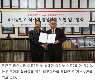 [쿠키 건강] 축산물전문 농업기업 다하누는 지난 28일 유기농 전문 농업기업 장안농장과 유기농 한우 직거래 활성화를 위한 MOU를 체결했다고 밝혔다.