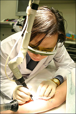 ◇봉합 풀고 난 후 지우개로 지우듯 뉴브이빔퍼펙타 레이저로 쓱싹~= 수술초기의 흉터는 붉은 색을 띤다. 현재 붉은 흉터 치료에 좋은 효과를 보이는 레이저는 뉴브이빔퍼펙타. 뉴브이빔퍼펙타 레이저는 수술흉터의 경우에는 실밥을 뽑은 후부터, 그 외의 흉터는 상처가 아문 후부터 치료가 가능하다. 뉴브이빔퍼펙타 레이저 치료는 흉터의 초기에 혈관증식을 억제해 과도한 흉터가 생기는 것을 막아준다. 레이저가 통과하는 위쪽 피부와 주위 조직에는 영향을 거의 미치지 않아 흉터가 남는 등의 부작용이 적다. 보통 실밥 제거 후부터 한 달 간격으로 브이빔 레이저 치료를 하면 흉터 예방에 도움이 되고 흉터가 붉어지는 것을 막을 수 있다. 또 퍼펙타의 냉각장치가 피부표면을 보호해주기 때문에 치료 후 다른 레이저에 비해 멍이 드는 것과 같은 자반증이 적게 생기고 생기더라도 빨리 없어지기 때문에 일상생활에 별 영향을 주지 않는다. 시술 시 마취가 필요 없을 정도로 통증이 적은 것도 큰 장점이다.