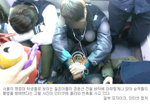 [쿠키 사회] 서울의 명문대 학생들로 보이는 젊은이들이 경춘선 전철 바닥에 아무렇게나 앉아 승객들의 통행을 방해했다는 고발 사진이 인터넷에 올라와 빈축을 사고 있다.