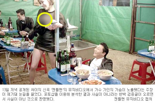 [쿠키 문화] 13일 저녁 공개된 싸이의 신곡 ‘젠틀맨’의 뮤직비디오(이하 뮤비)가 인터넷 최고 이슈로 떠올랐다. 네티즌들은 밤새도록 이번 뮤비가 세계적인 신드롬을 불러온 ‘강남스타일’의 아성을 깰지 논쟁을 펼치는 등 높은 관심을 보였다. 특히 일부 네티즌들은 뮤비에서 가수 가인의 가슴이 노출됐다는 주장을 펼쳤는데, 포토샵 이용해 분석한 결과 사실이 아니라는 반박 검증글이 오르면서 해프닝으로 끝이 났다.