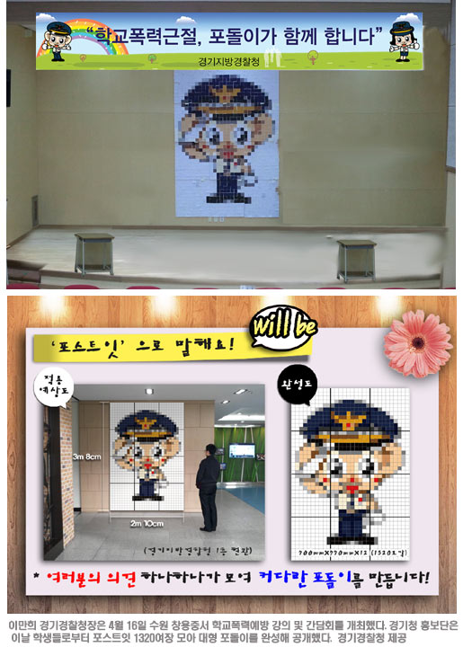포돌이 그림은 경기청 홍보단이 지난달부터 한 달여 도내 초·중·고교 등을 돌며 범죄예방극 등 공연을 한 뒤 학생과 학부모, 교사 등으로부터 학교폭력 근절 염원글이 적힌 포스트잇을 받아 제작됐다.
