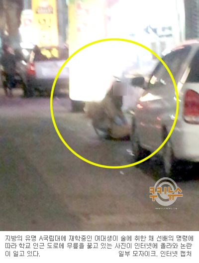 [쿠키 사회] 지방의 유명 A국립대에 재학중인 여대생이 술에 취한 채 선배의 명령에 따라 학교 인근 도로에 무릎을 꿇고 있는 사진이 인터넷에 올라와 논란이 일고 있다. 네티즌들은 여대생에게 ‘무릎녀’라는 별명을 붙이고 “지성의 요람이어야 할 대학이 엉뚱한 규율을 강요하는 비이성적인 공간이 돼버렸다”며 혀를 차고 있다.