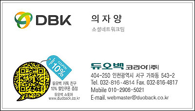 인간공학 전문기업 듀오백코리아㈜는 최근 전 직원의 명함을 교체해 발급했다. 바뀐 명함에는 ‘QR코드’가 하나 삽입 됐는데 스캔 하면 듀오백의 공식 온라인몰 ‘듀오백스토어’에서 쓸 수 있는 10% 할인쿠폰을 받을 수 있다.