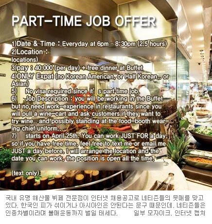 [쿠키 사회] 국내 유명 해산물 뷔페 전문점이 인터넷 채용공고로 네티즌들의 뭇매를 맞고 있다. 한국인 피가 섞이거나 아시아인은 안 된다는 문구 때문인데, 네티즌들은 인종차별이라며 불매운동까지 벌일 태세다.