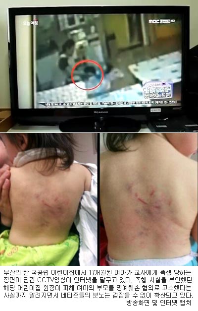 부산의 한 국공립 어린이집에서 17개월 짜리 여아가 교사에게 폭행을 당하는 장면이 담긴 CCTV영상이 인터넷을 달구고 있다. 애초 폭행 사실을 전면 부인했던 해당 어린이집 원장이 적반하장식으로 피해 여아의 부모를 명예훼손 혐의로 고소했다는 사실까지 알려지면서 네티즌들의 분노는 걷잡을 수 없이 확산되고 있다.