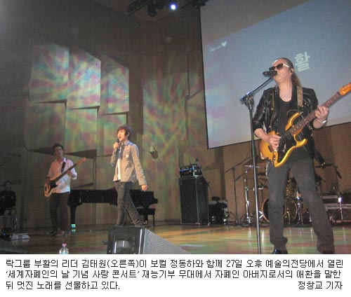 27일 오후 3시쯤 서울 예술의전당 IBK캠버홀에서 열린 ‘2013세계자폐인의날 기념 사랑콘서트’의 재능기부 무대에 출연한 락그룹 부활의 리더 김태원은 “지구라는 별에서 더 이상 장애인을 차별하지 일이 없기를 바란다”며 이같이 말했다.