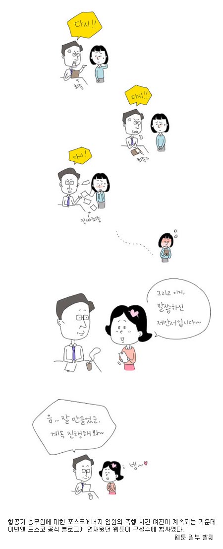 [쿠키 사회] 항공기 승무원에 대한 포스코에너지 임원의 폭행 사건 여진이 계속되는 가운데 이번엔 포스코 공식 블로그에 연재됐던 웹툰이 구설수에 휩싸였다. 라면 때문에 물의를 일으킨 상무의 행동은 우월적 지위를 이용한 상사의 행동을 당연시하는 포스코의 조직 문화에서 나온 것이 아니냐는 곱지 않은 시선을 보내고 있기 때문이다. 때마침 최근 포스코 워크샵에서는 갑(甲) 노릇한 조직문화에 대한 자성의 목소리가 나왔다.
