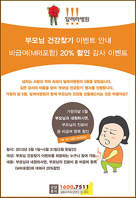[쿠키 건강] 척추관절 달려라병원은 가정의 달 5월을 맞아 부모님을 모시고 오는 분들에게 MRI(자기공명영상촬영) 등 비급여 20% 할인 행사인 ‘부모님 건강 찾기 이벤트’를 진행한다고 밝혔다.