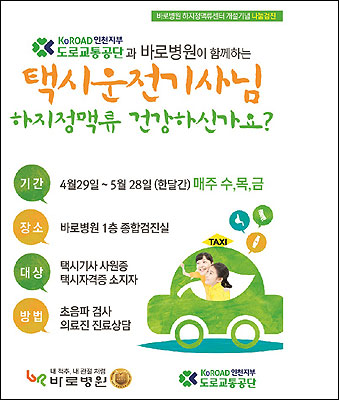 [쿠키 건강] 척추관절특화 바로병원은 도로교통공단 인천지부와 함께 오는 28일까지 택시운전사를 대상으로 하지정맥류 나눔검진을 실시한다고 밝혔다.