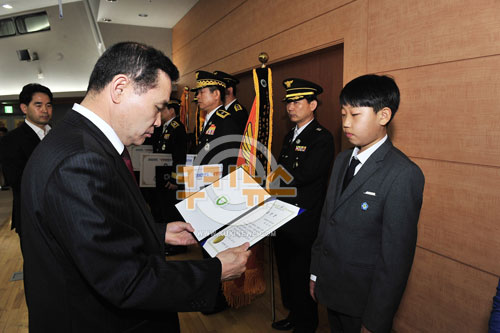 [쿠키 사회] 남상호 소방방재청장이 3일 정부서울청사 별관 국제회의장에서 충북 영동군에서 발생한 주택 화재 확대를 막은 허남웅(15·영동중 3)군에게 표창장을 수여했다.